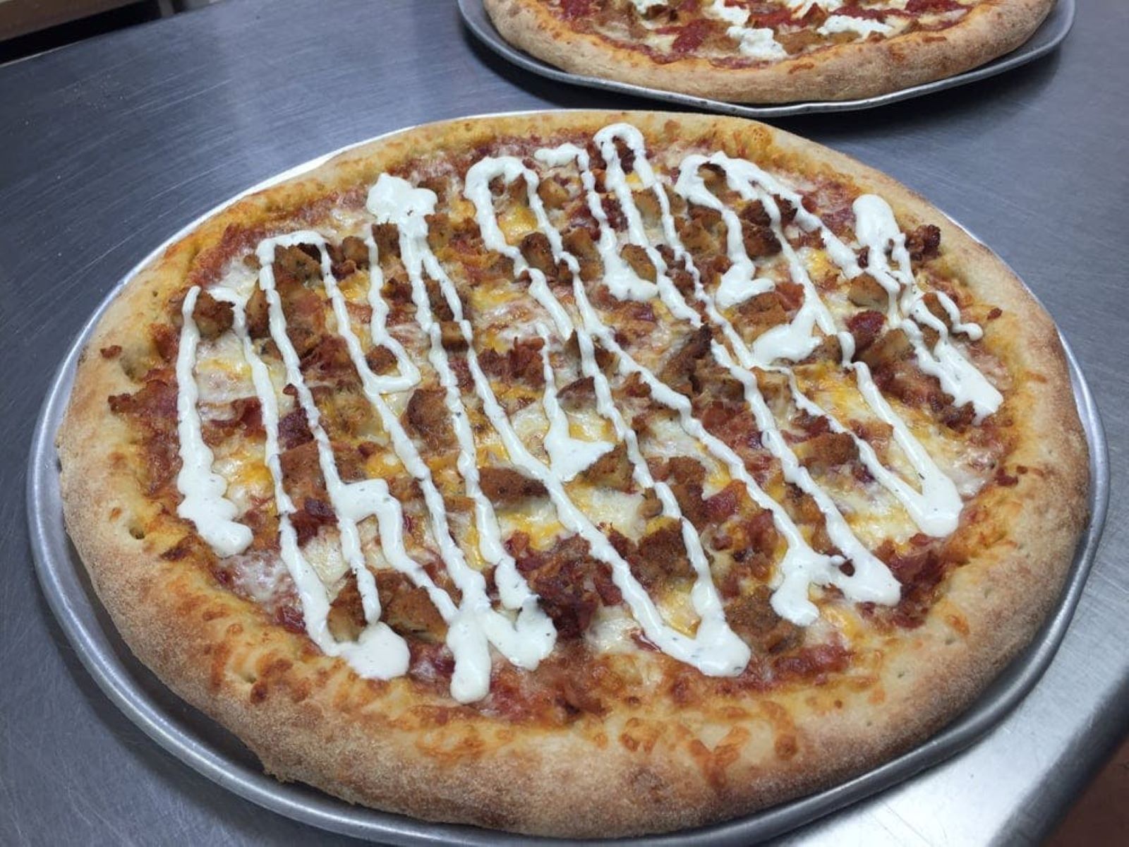 Breaded Chicken Cutlet, Bacon, Ranch Dressing, Cheddar & Mozzarella Cheese, Tomato Sauce.