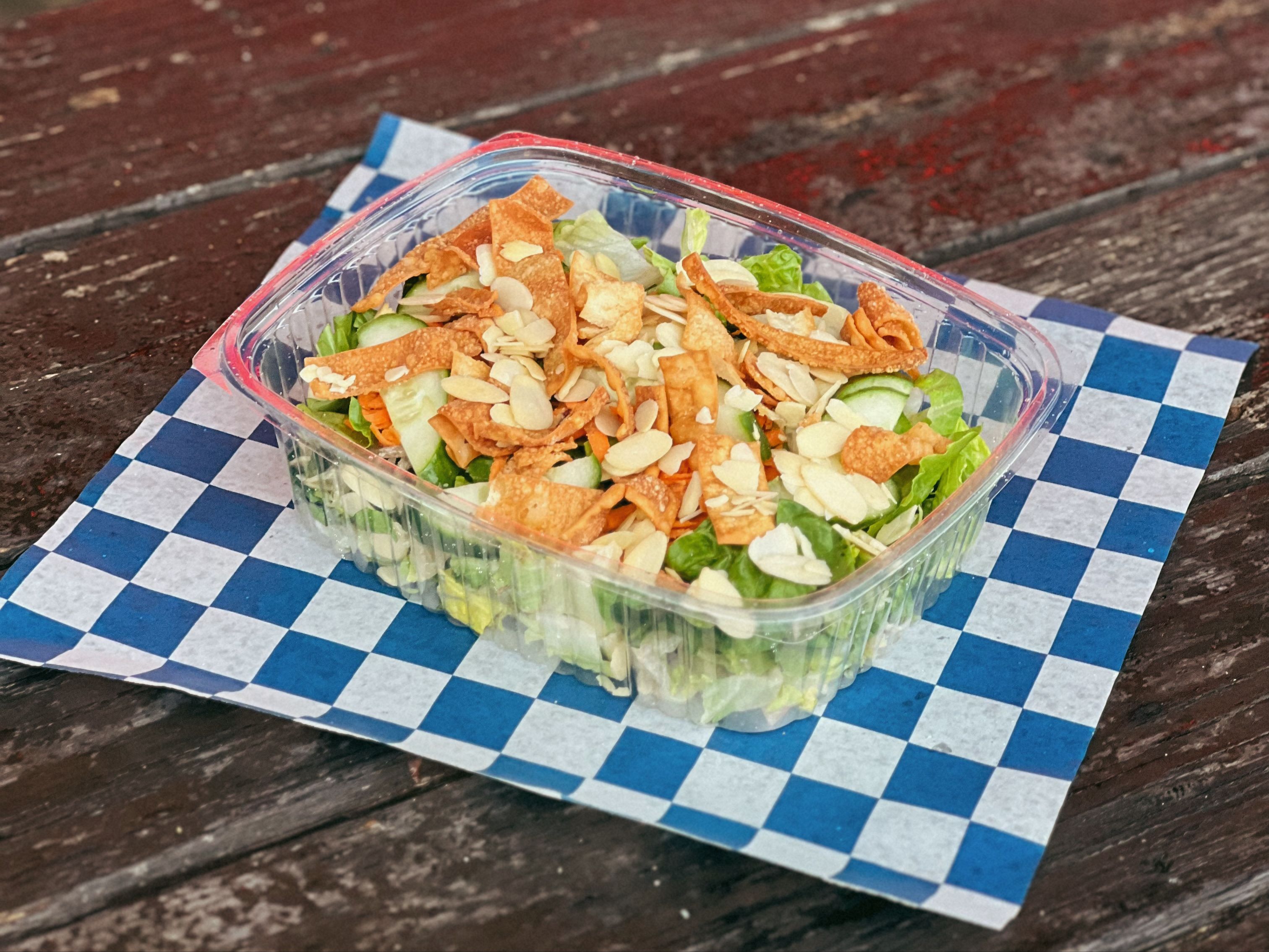 Romaine lettuce, carrot, Cucumber, Wontons, Almonds, Asian Sesame Vinaigrette.