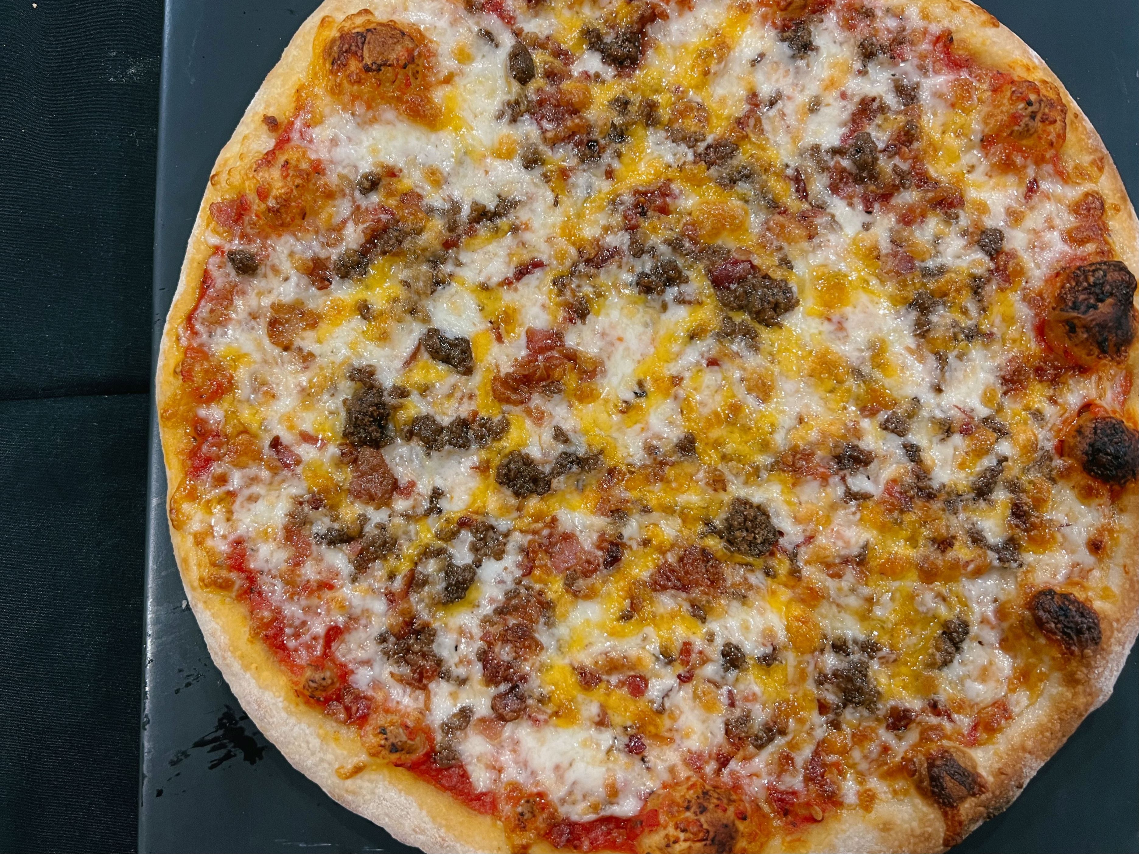 Bacon, Ground Beef, Cheddar, Mozzarella Cheese & Tomato Sauce.