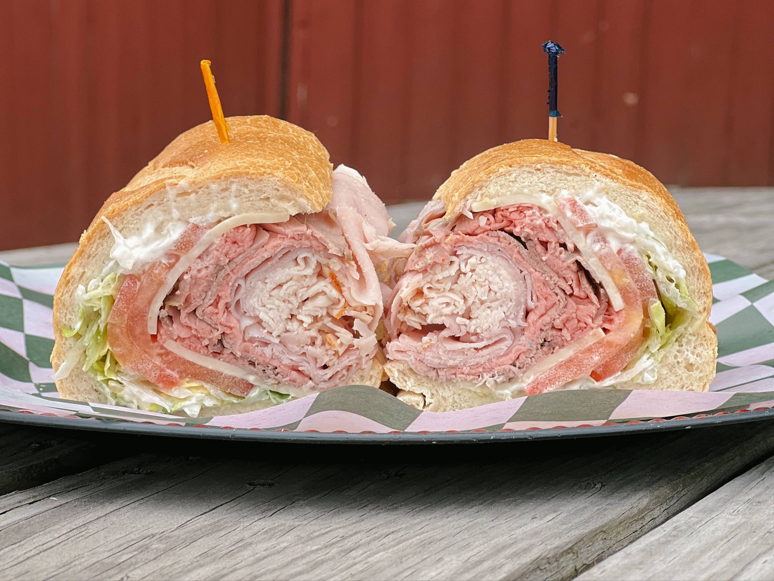 Ham, Turkey, Roast Beef, American Cheese, Lettuce, Tomatoes & Mayo.