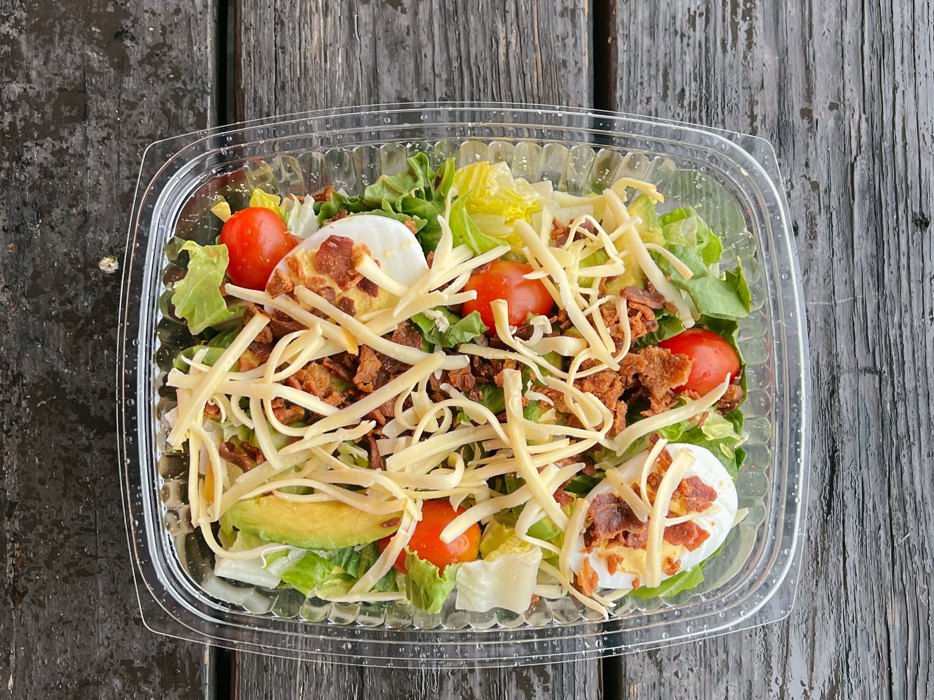 Romaine Lettuce, Tomato, Avocado, Hard Boiled Egg, Bacon, Gouda, and Bleu Cheese Dressing.