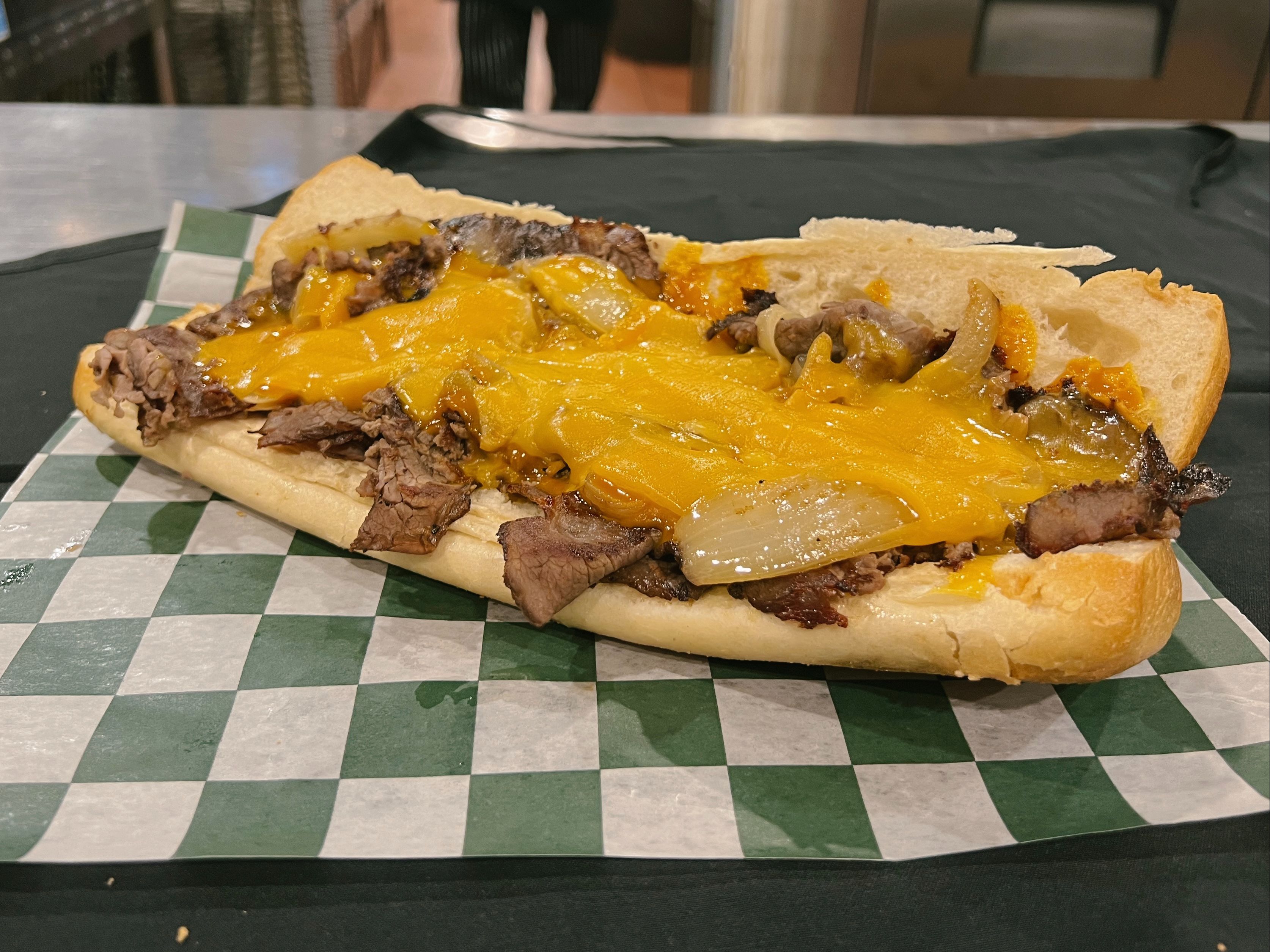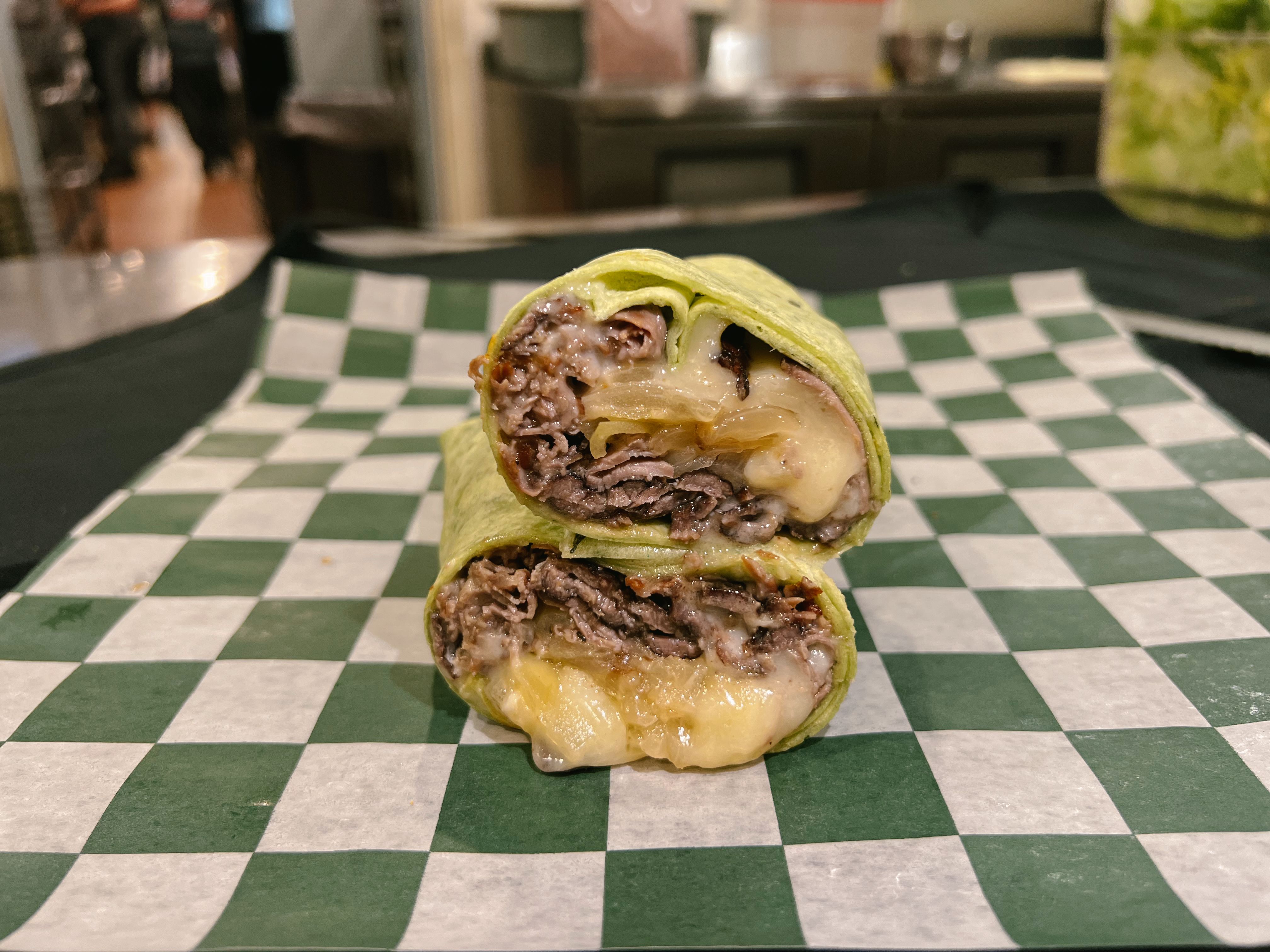 Grilled Roast Beef, Onions, Cheddar Cheese & Gold Rush Sauce.