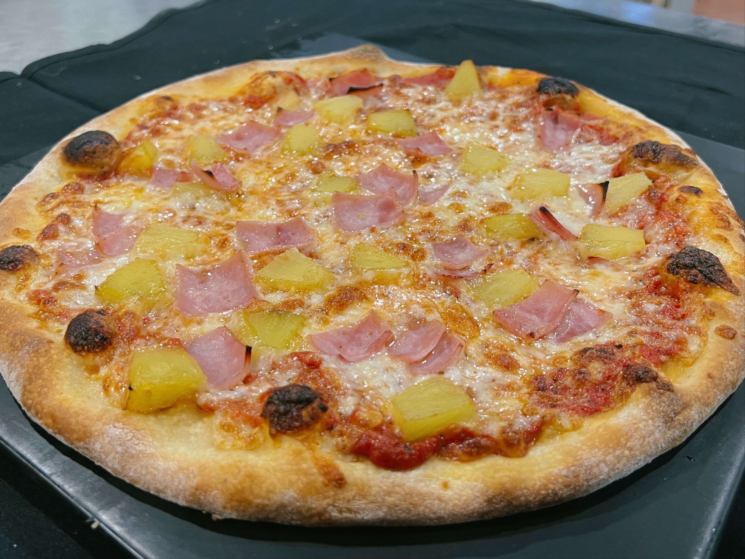 Ham, Pineapple, Mozzarella, Tomato Sauce.