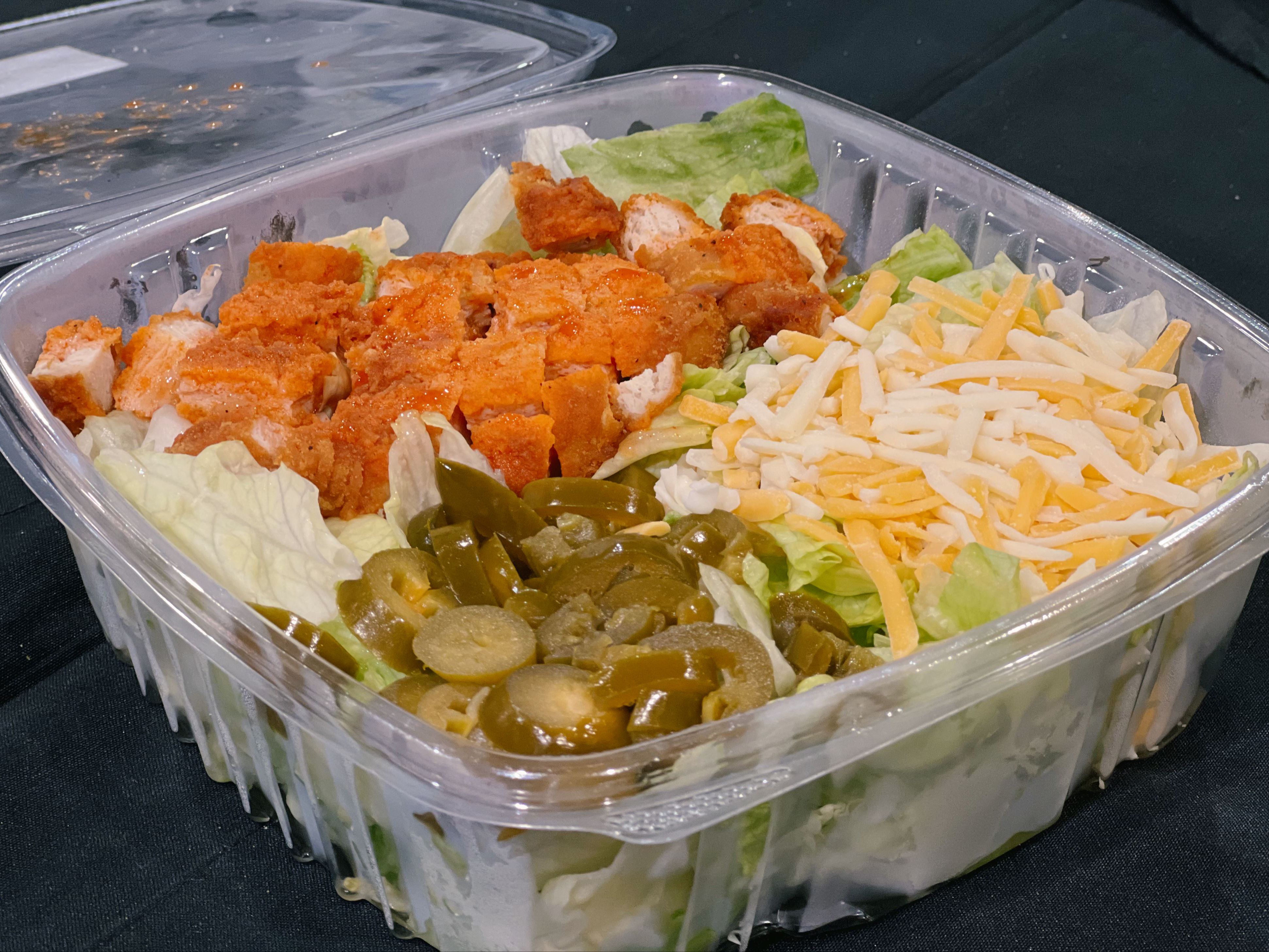 Iceberg Lettuce, Jalapeno, Breaded Chicken, Cheddar Jack Cheese, Smokin Sauce, and Ranch Dressing.