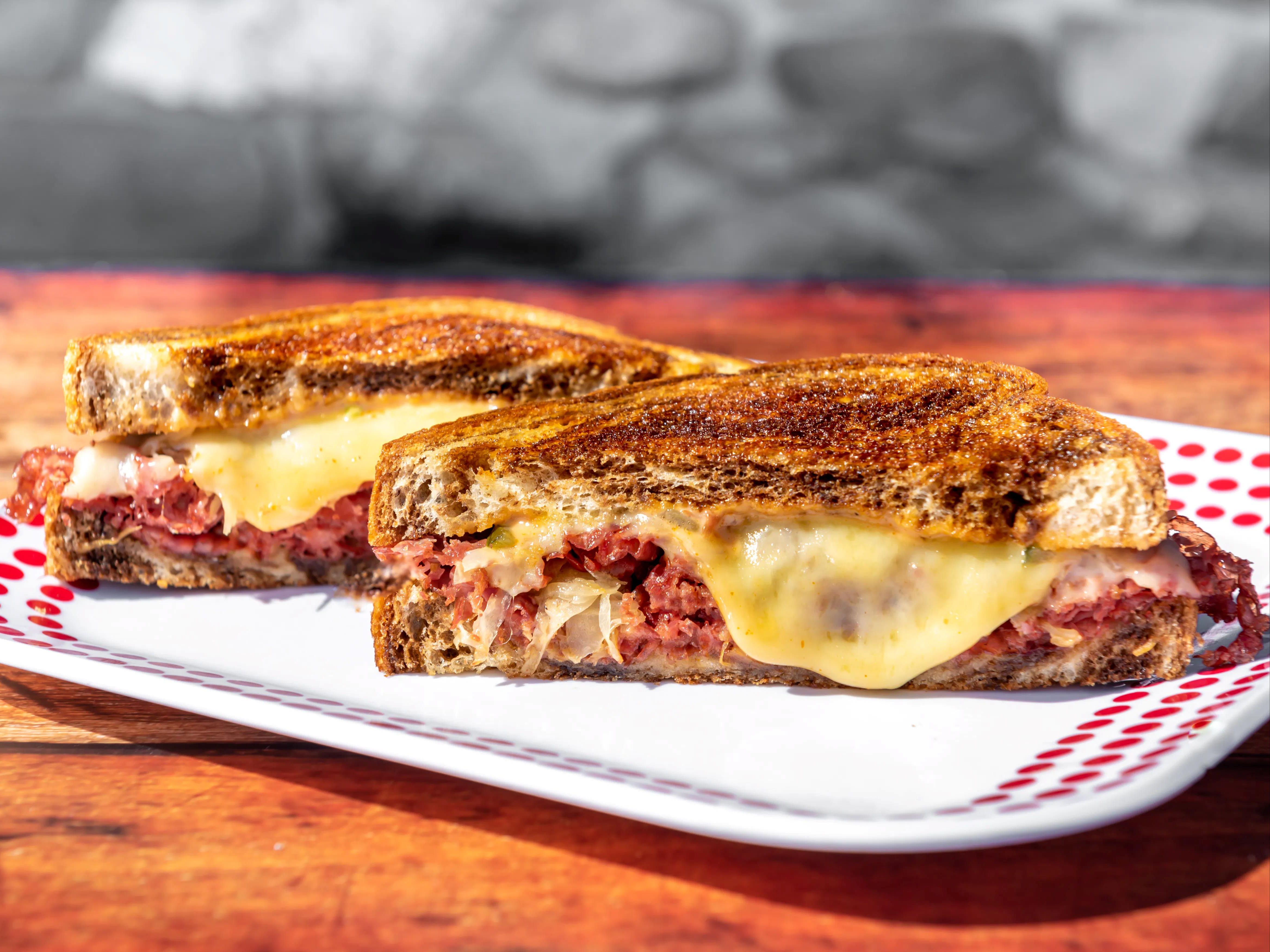 Grilled Pastrami or Corned Beef with Swiss, Sauerkraut & Thousand Island.