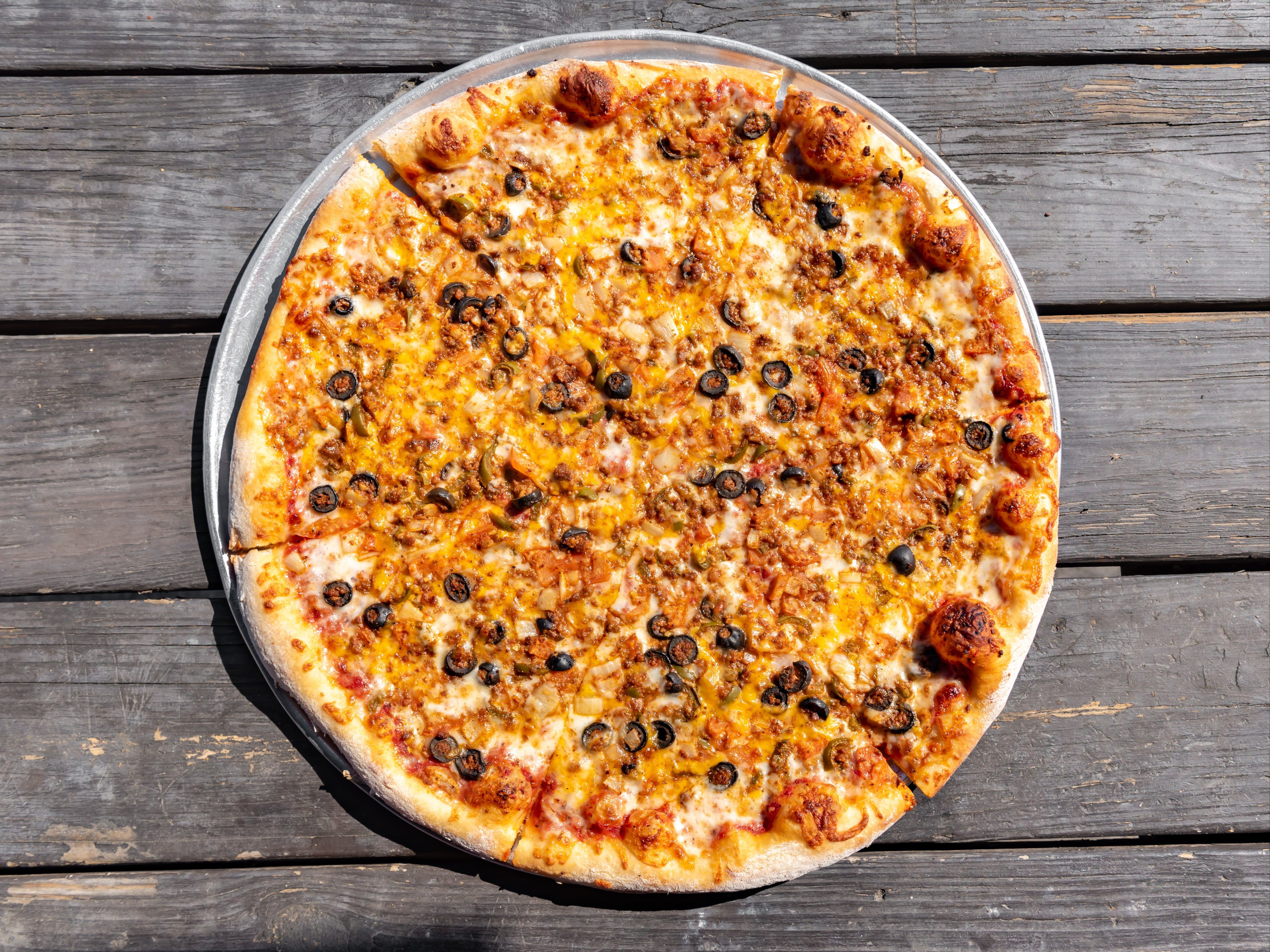 Beef, Onions, Tomatoes, Olives, Jalapenos, Cheddar, Mozzarella, Tomato Sauce