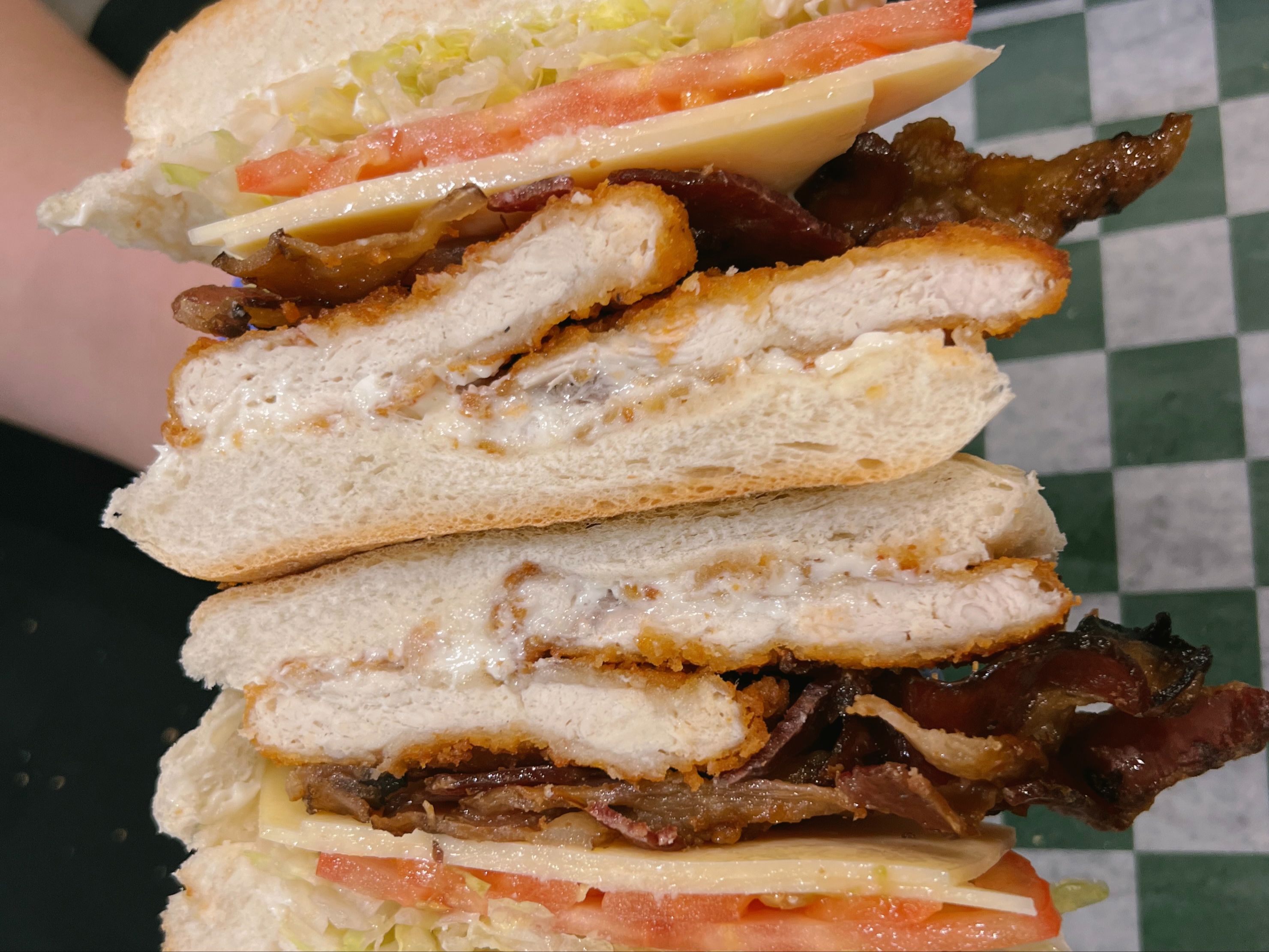 Breaded Chicken Cutlet, Swiss, Bacon, Lettuce, Tomatoes & Mayo.