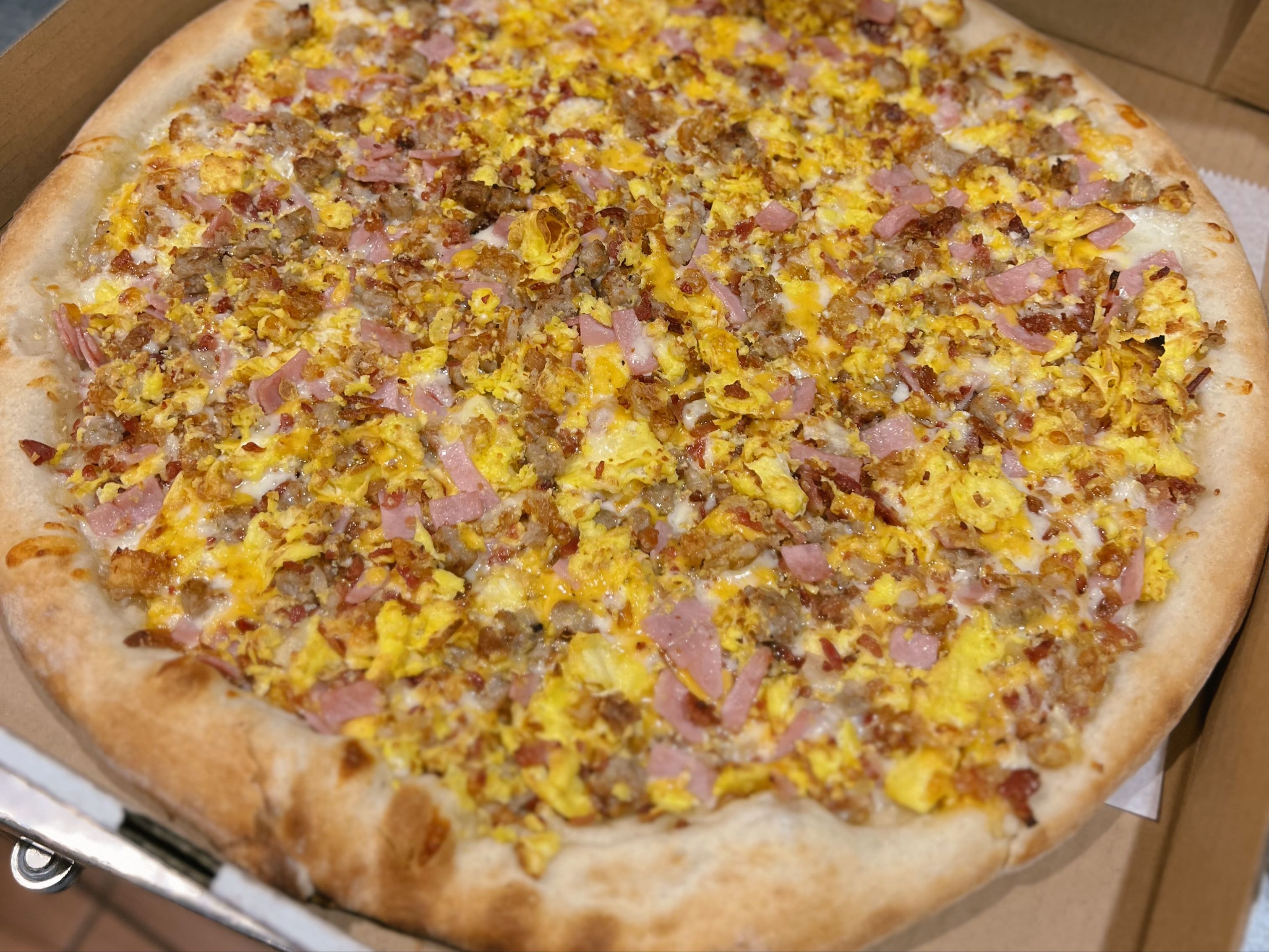 Scrambled Eggs, Bacon, Ham, Sausage, Hash Browns, Mozzarella, Cheddar Cheese.
