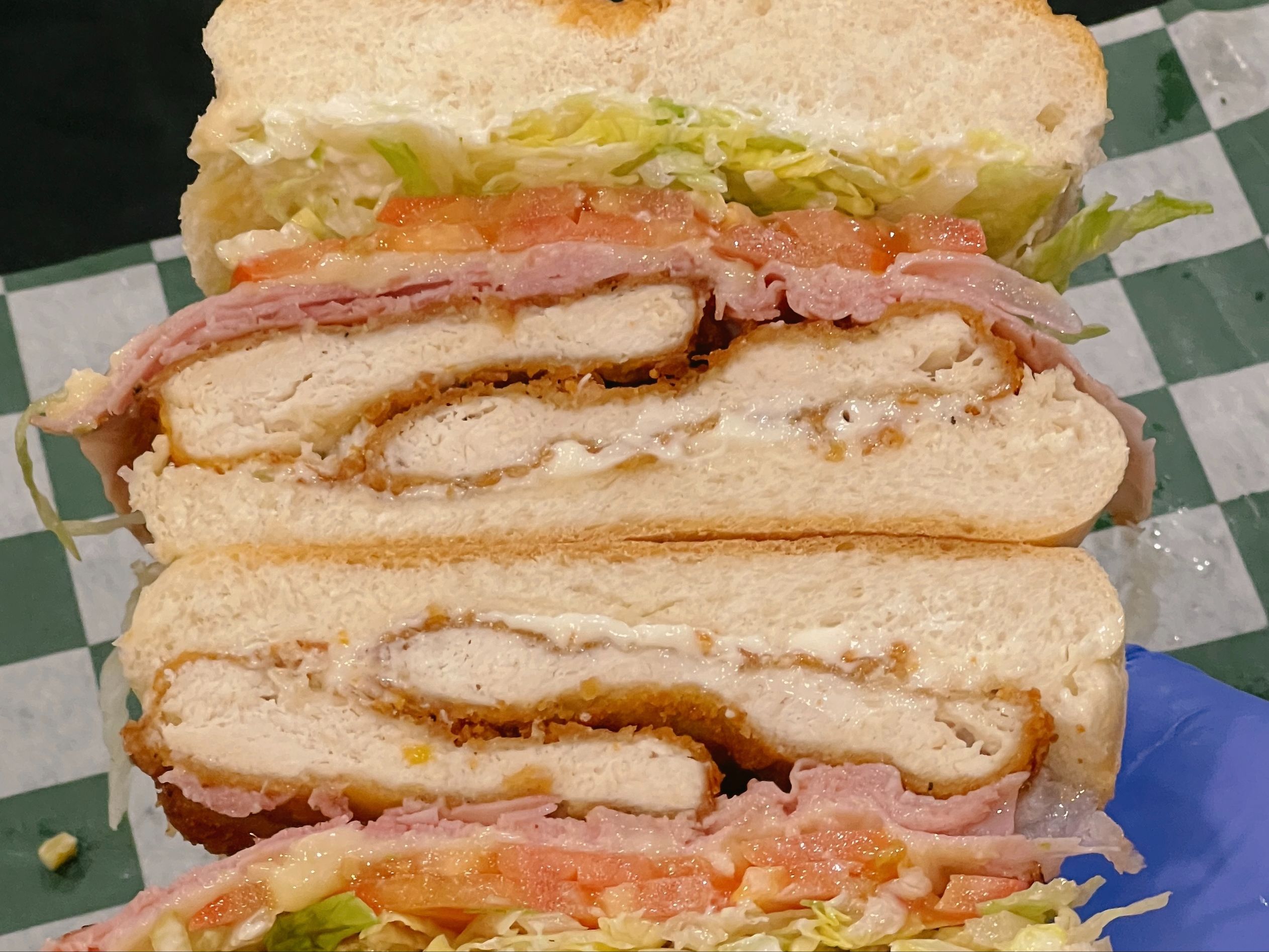 Breaded Chicken Cutlet, Ham, Swiss, Lettuce, Tomatoes & Mayo.