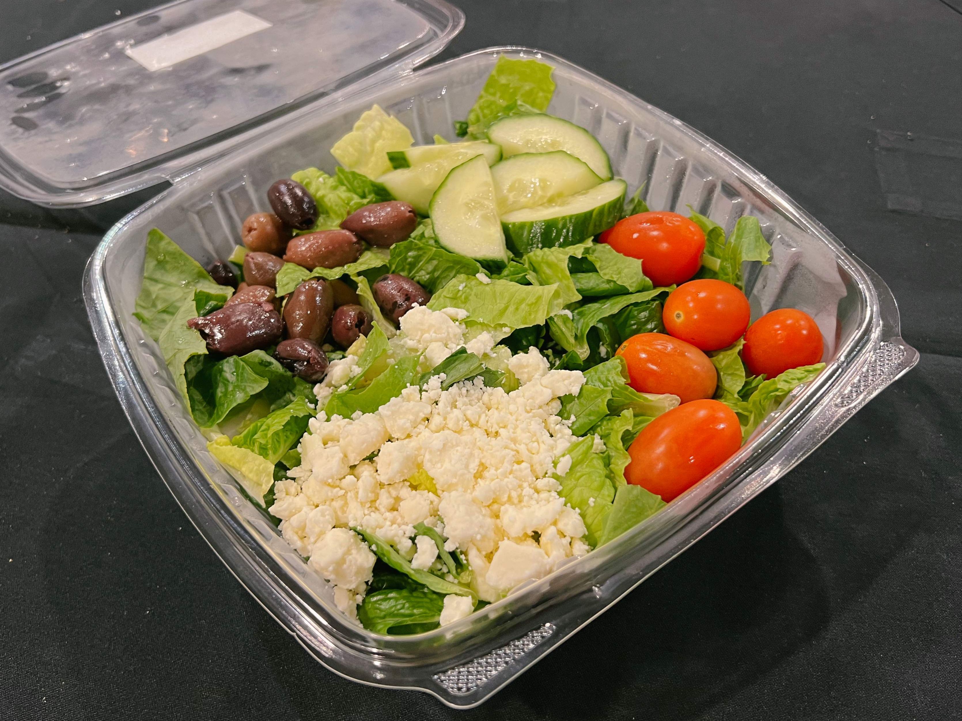 Romaine lettuce, Cucumber, Tomato, Olives, Feta, and Greek Dressing.