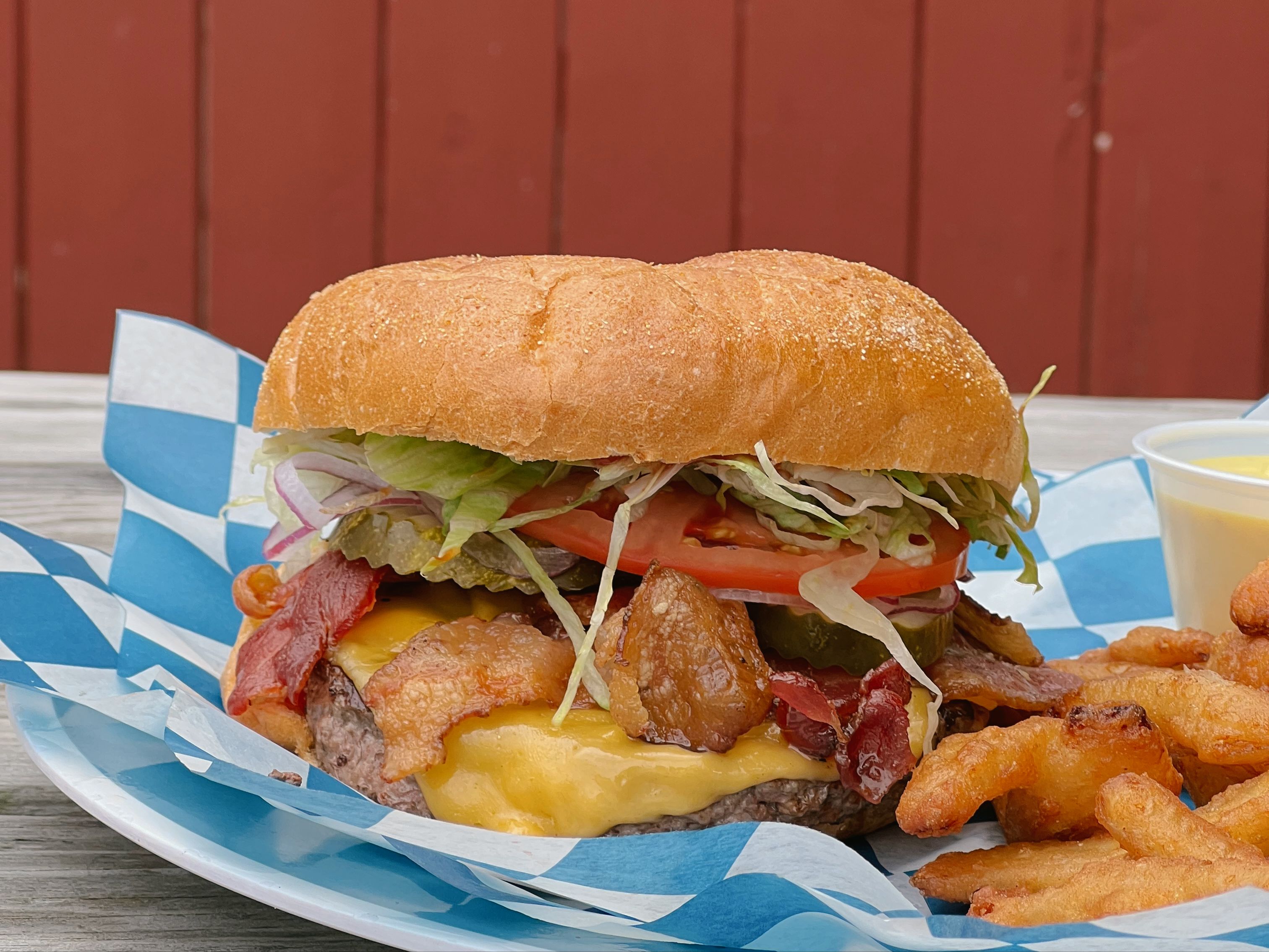Beef Burger, Lettuce, Tomatoes, Onions, Pickles.