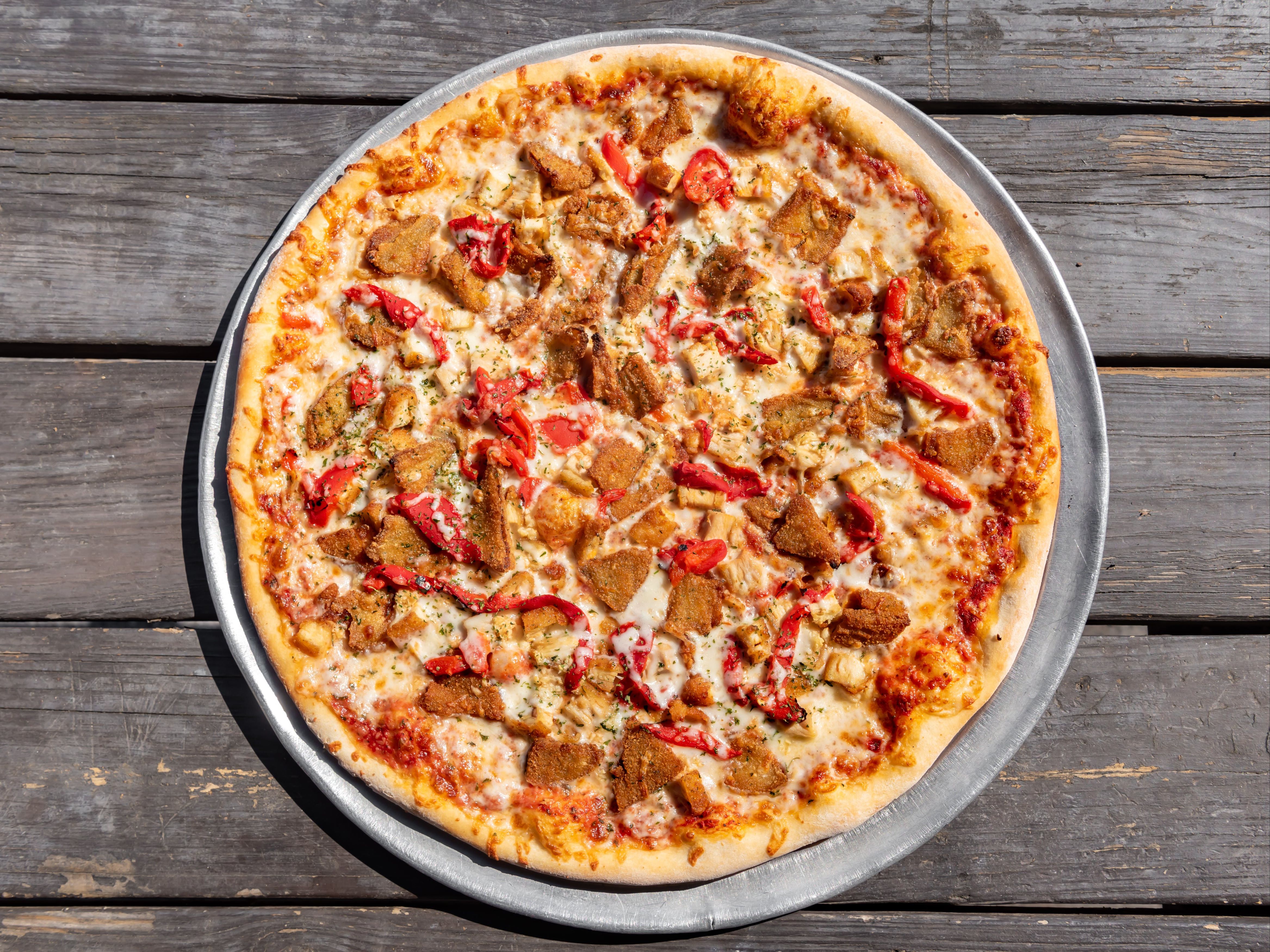 Chicken, Onions, Tomatoes, Olives, Jalapenos, Cheddar, Mozzarella, Tomato Sauce.