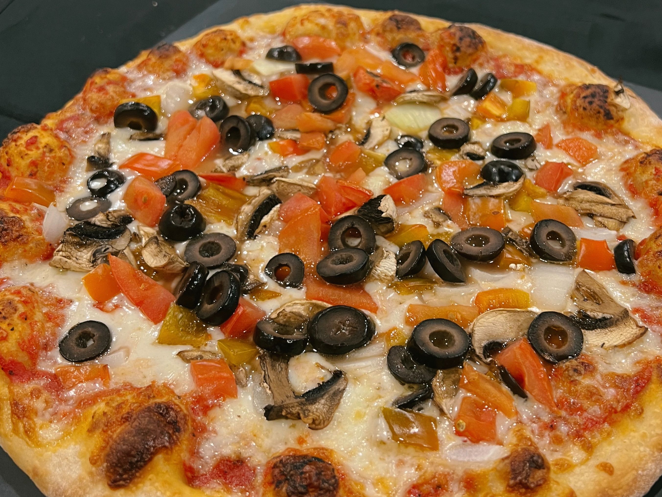 Peppers, Onions, Olives, Mushrooms, Tomatoes, Mozzarella, Tomato Sauce.