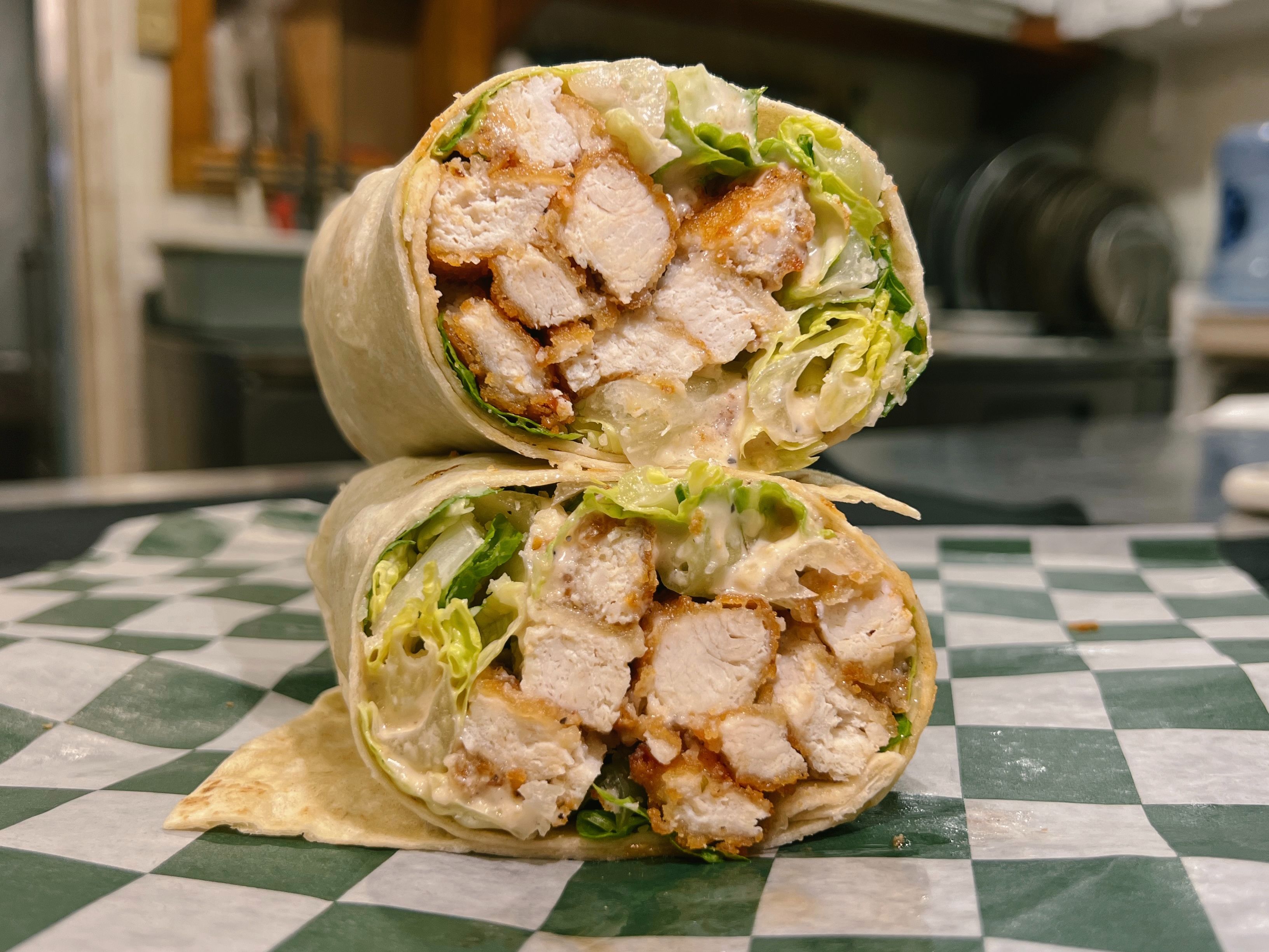 Chicken Cutlet, Parmesan, Romaine Lettuce & Caesar Dressing.