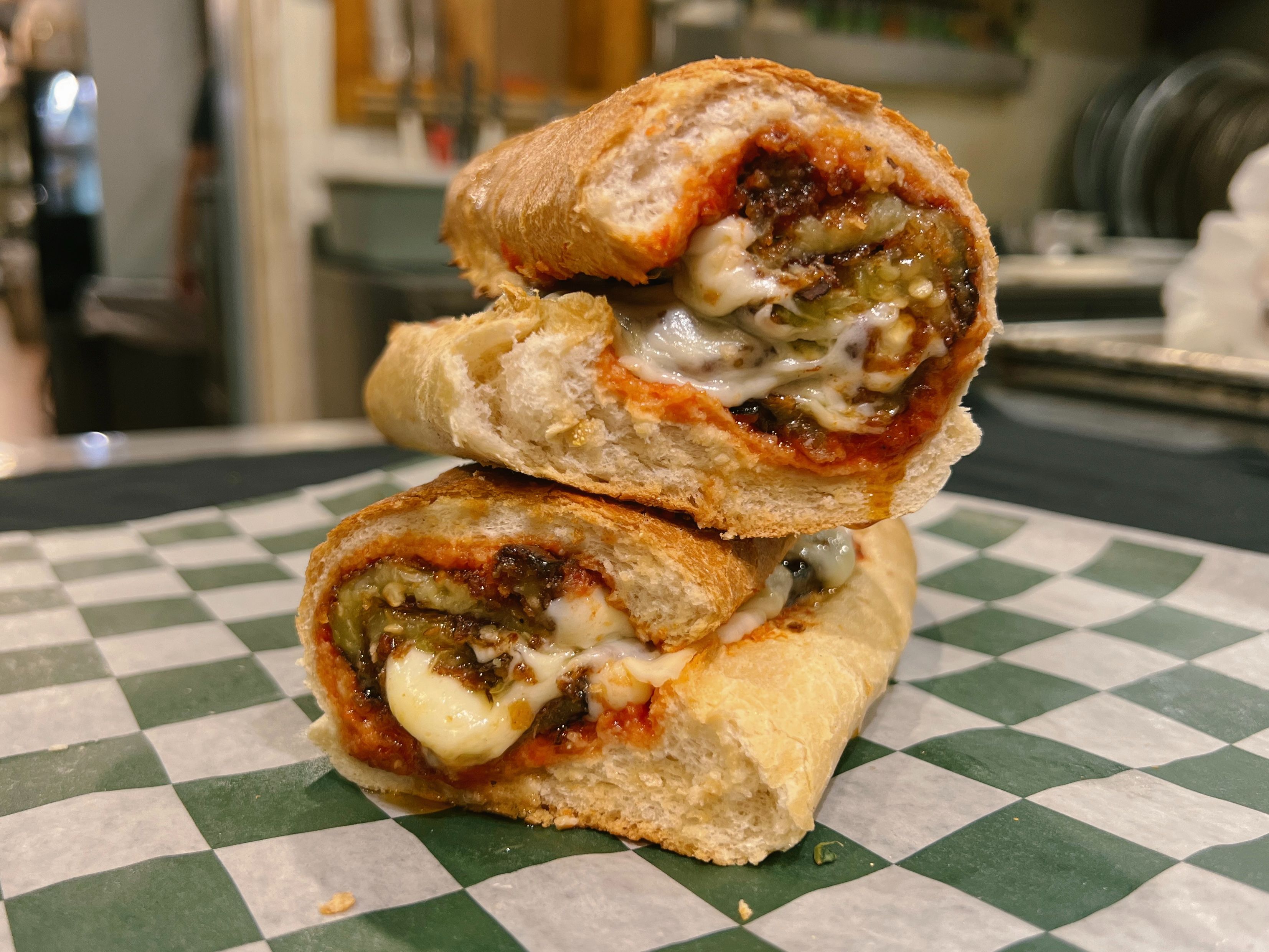 Breaded Eggplant, Chicken Cutlet, Roasted Red Peppers, Garlic, Mozzarella, Tomato Sauce.