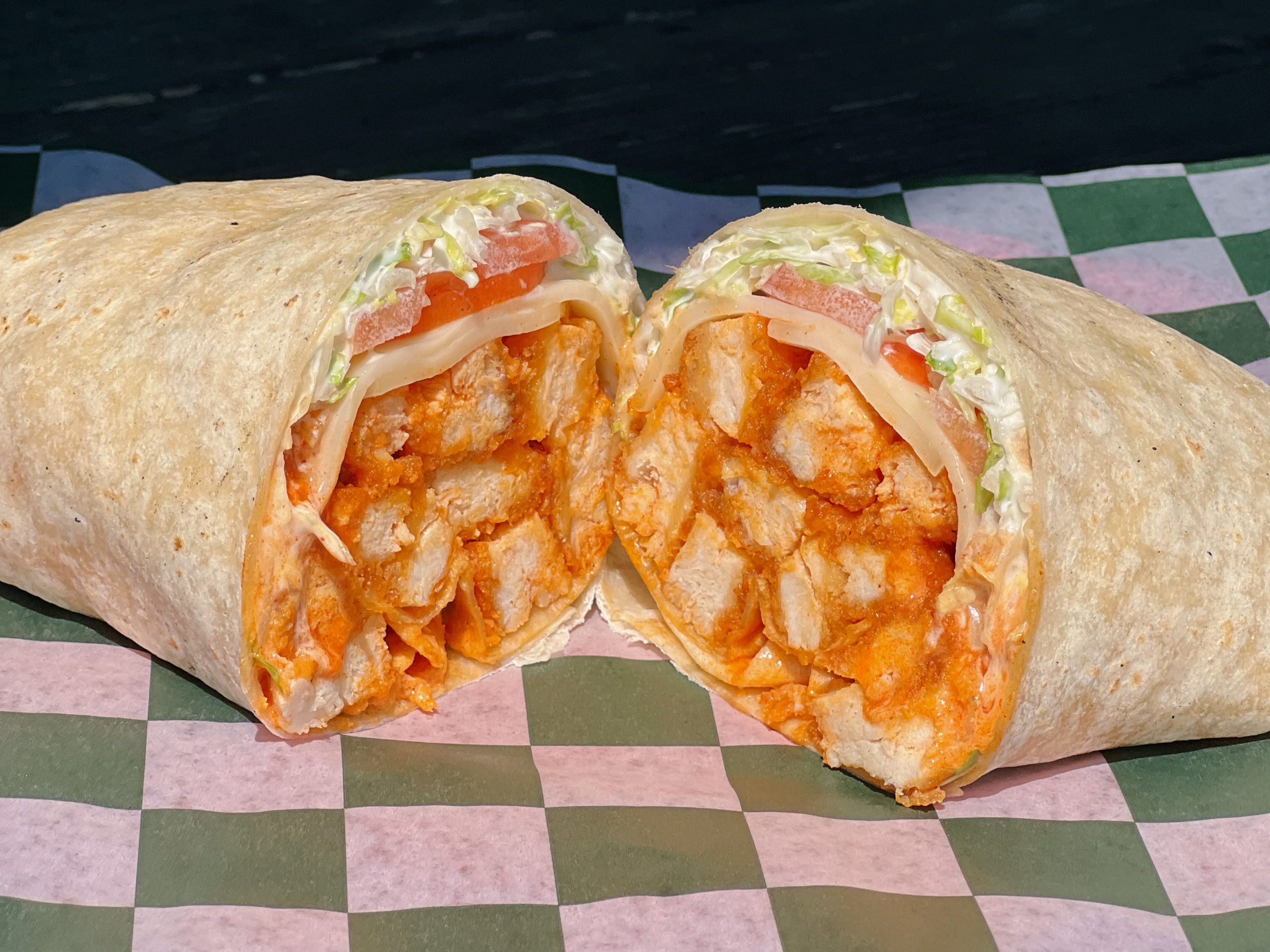 Buffalo Chicken Cutlet, Monterey Jack Cheese, Lettuce, Tomatoes & Bleu Cheese Dressing.