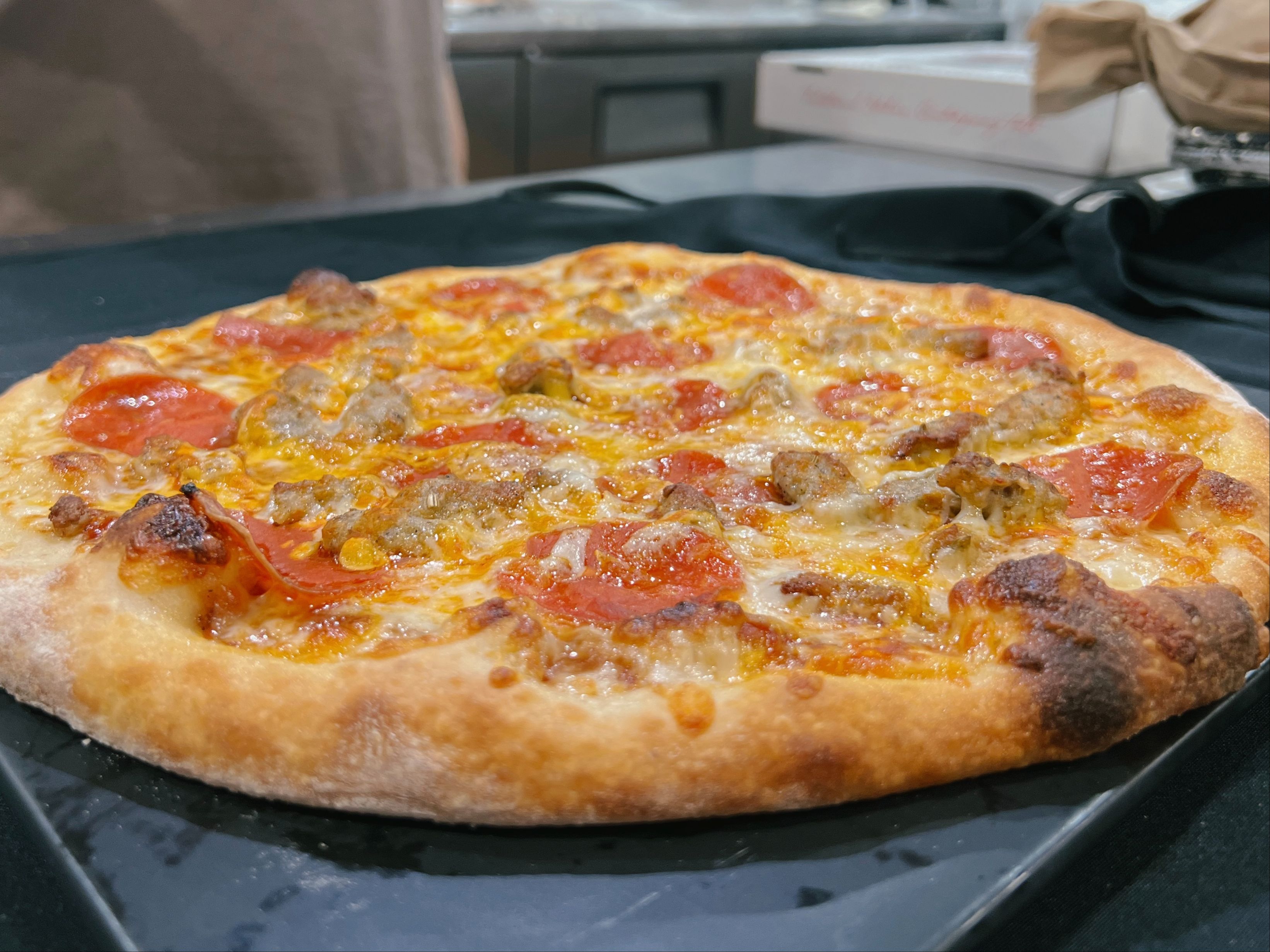 BBQ Sauce Base, Sausage, Pepperoni, Hot Sauce, Cheddar & Mozzarella Cheese.