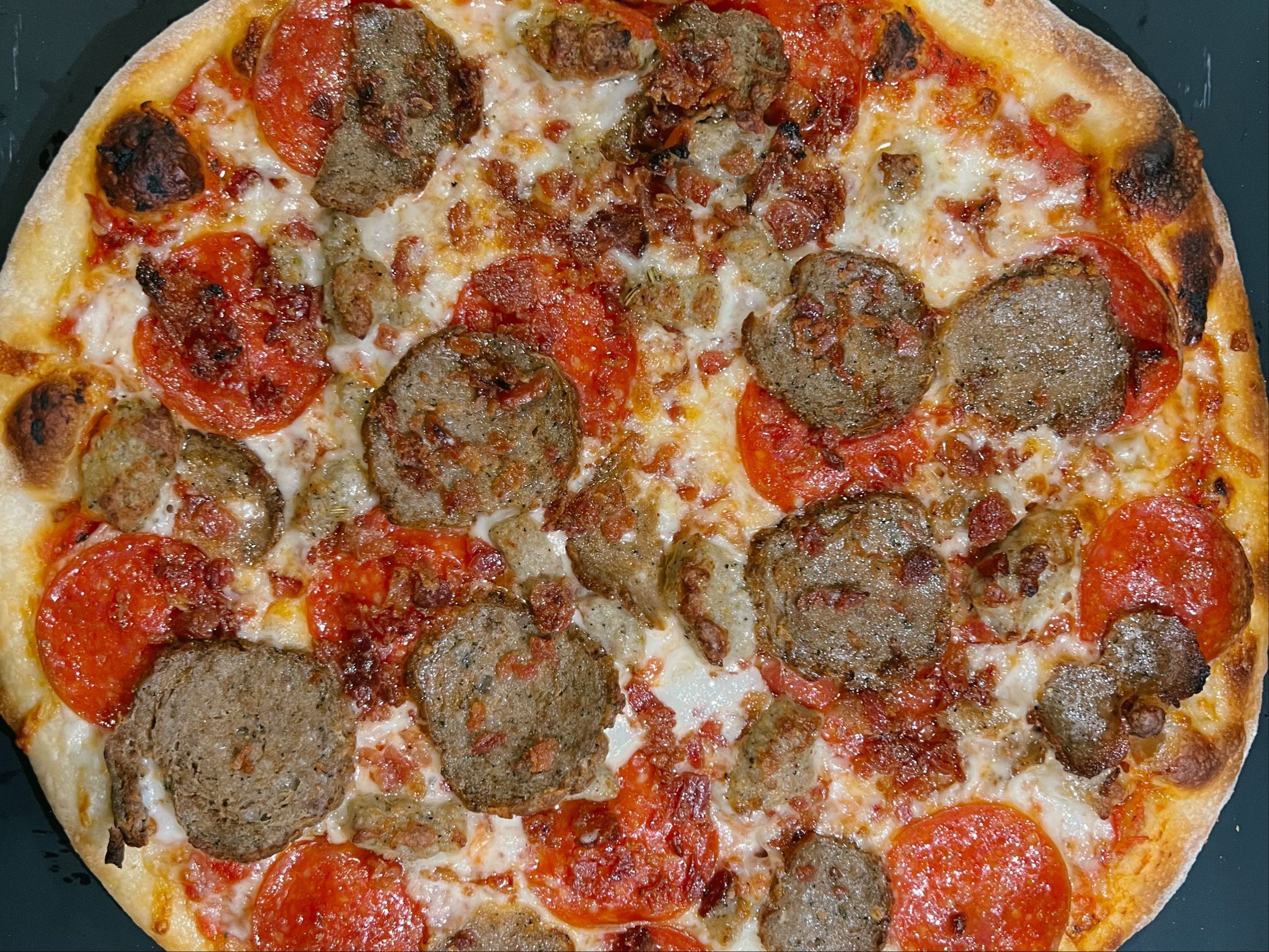 Pepperoni, Sausage, Bacon, Meatballs, Mozzarella, Tomato Sauce.