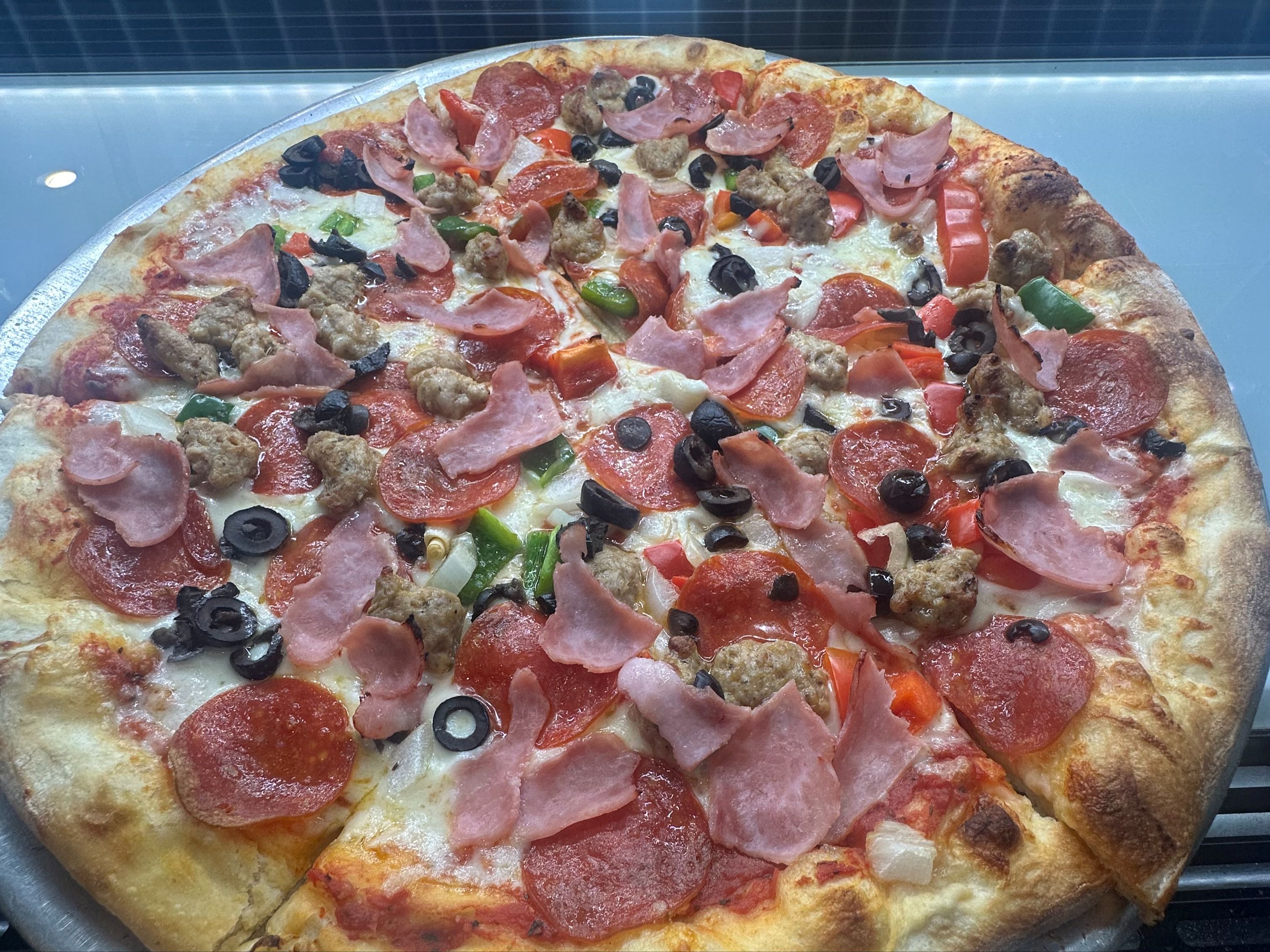 Ham, Sausage, Pepperoni, Olives, Onions, Peppers, Mozzarella, Tomato Sauce.
